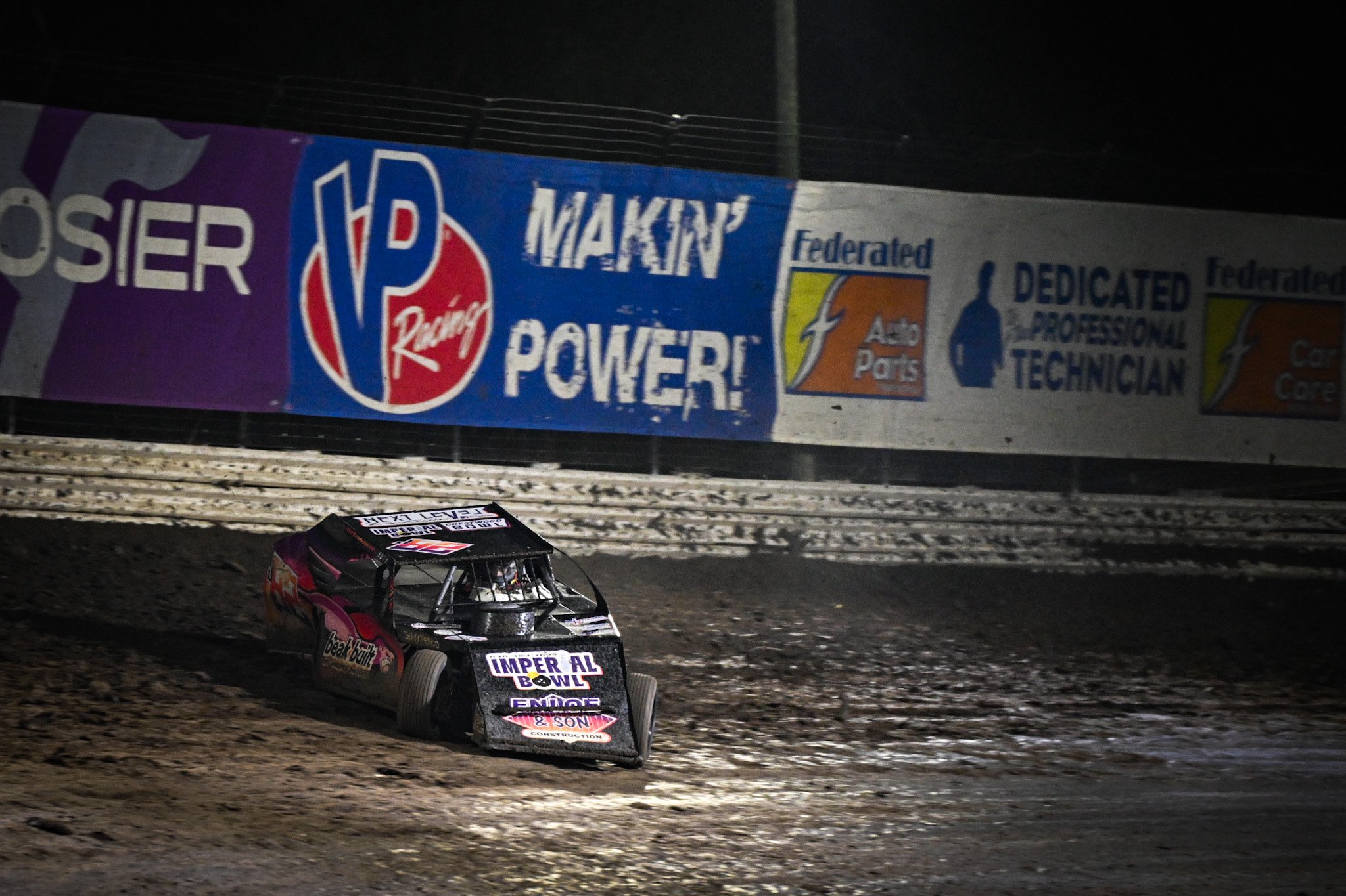 A black and pink custom race car driving on a dirt track with sponsorship logos, including Crestwood Bowl, Enloe & Son Construction, and others.