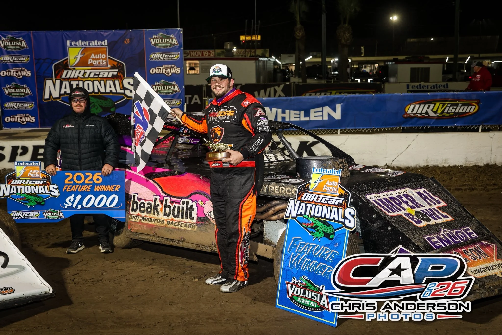 A race car driver in a black and orange racing suit holding a checkered flag stands next to a man in a white and gray shirt with a microphone at a nighttime dirt racetrack. The car behind them is covered in dirt and sponsors, and there are banners and signs indicating a race event, including a sign that says 'Feature Winner 2024'.