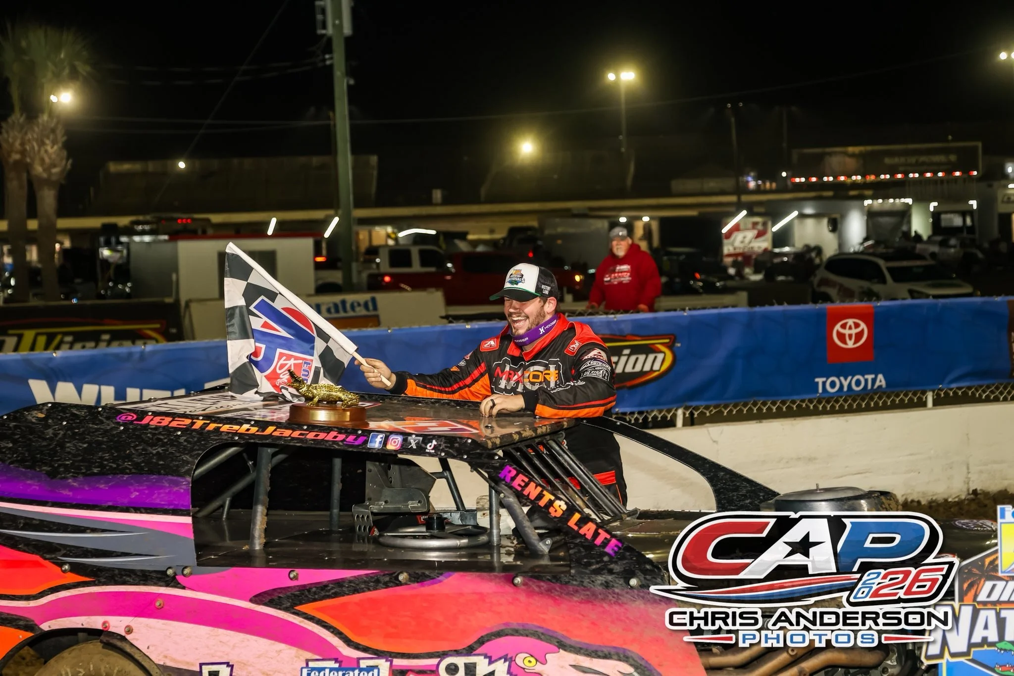Black stock car with the number J82 on the side, racing on a dirt track at night, with a driver celebrating by raising a checkered flag.